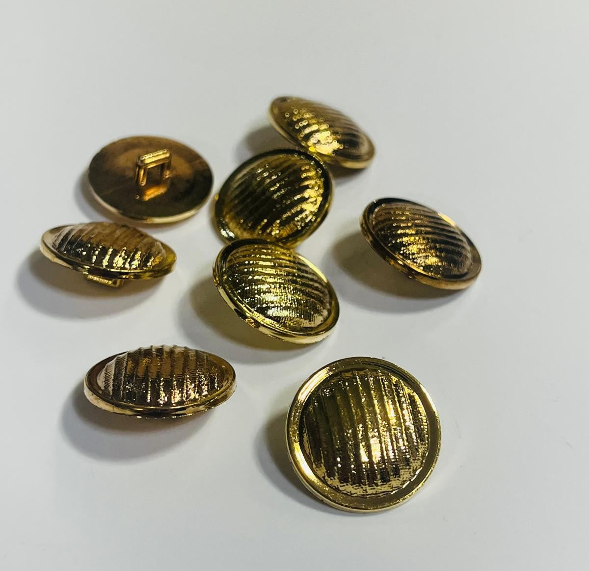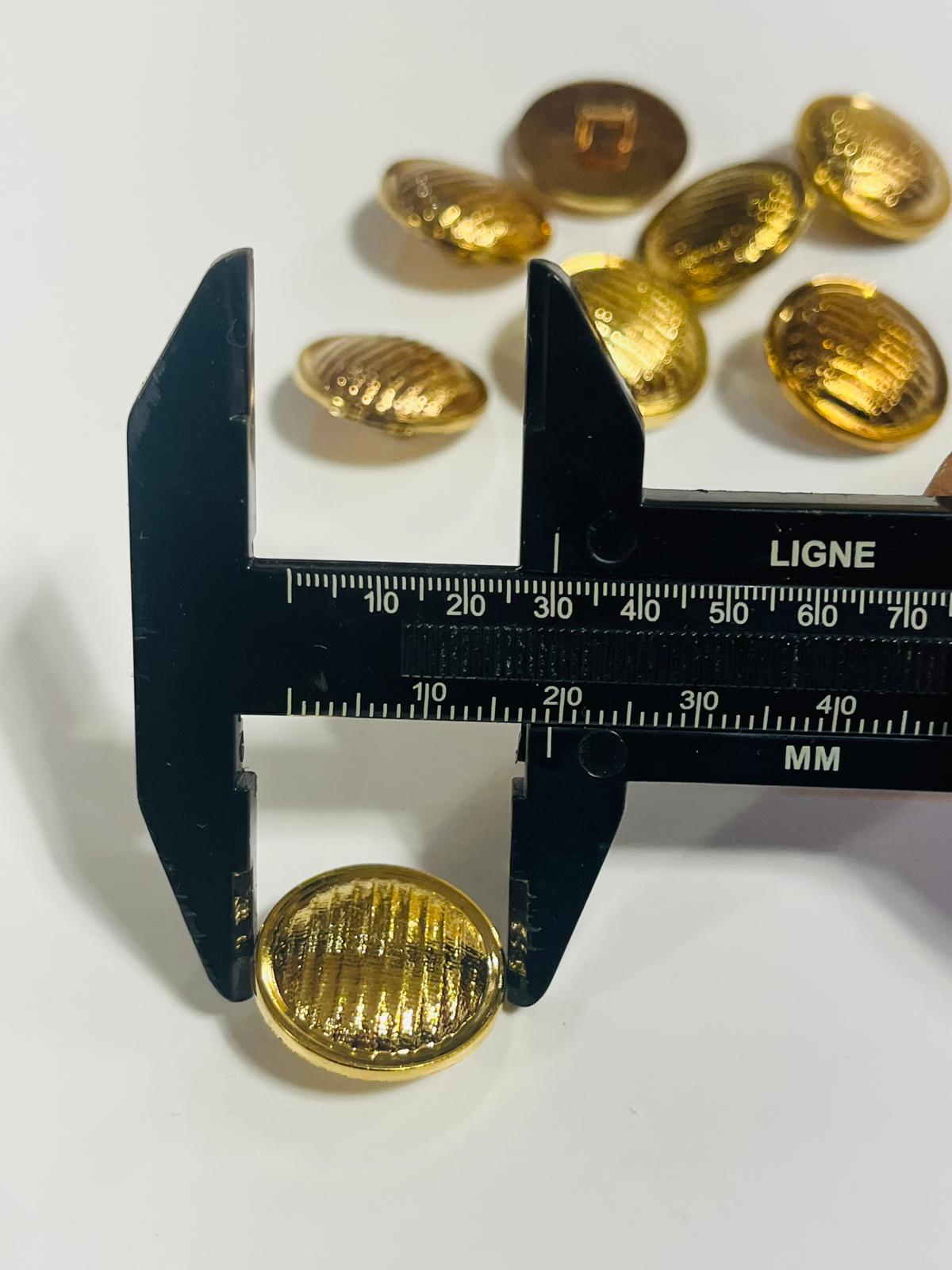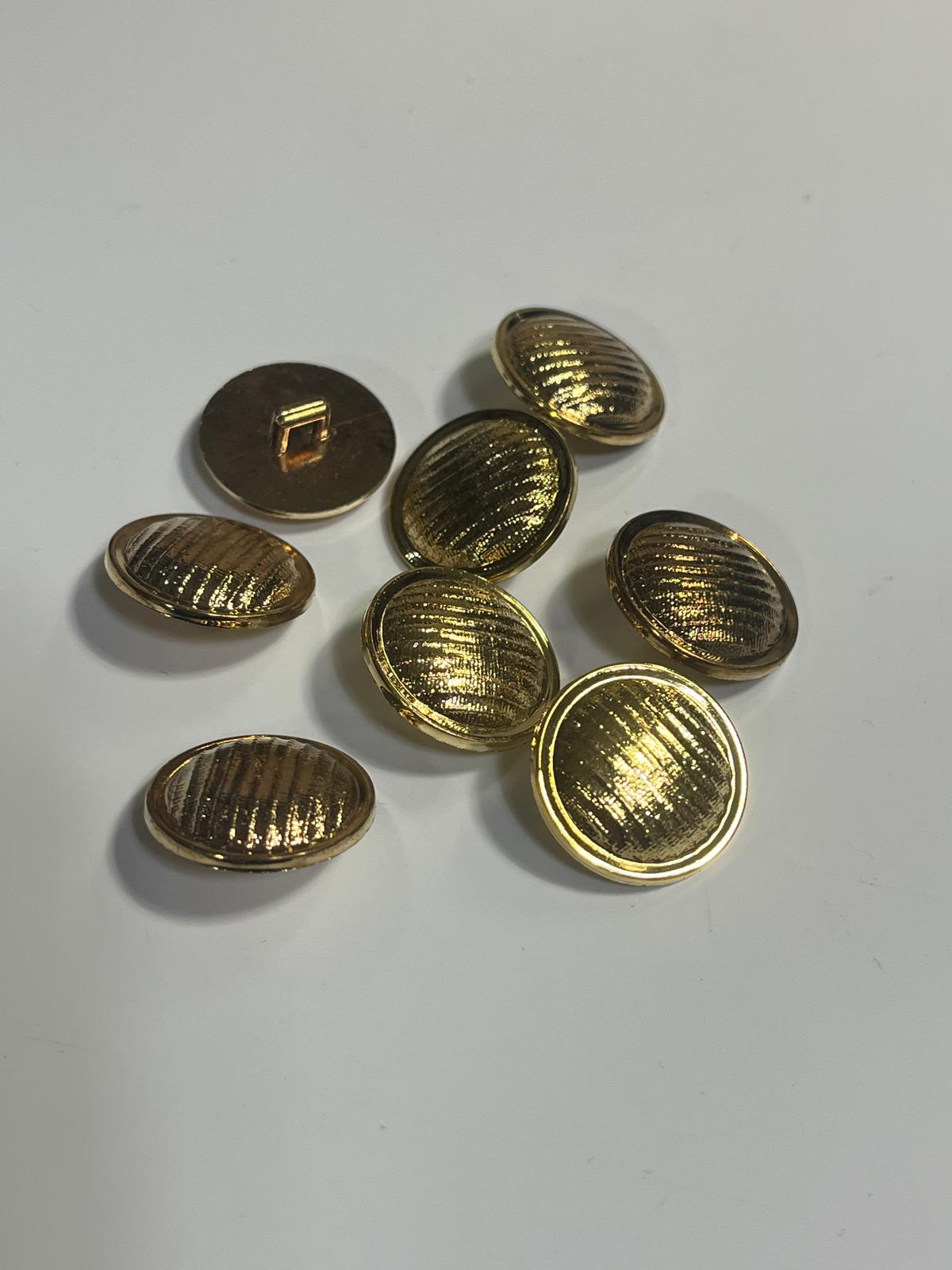Gold-tone acryllic shank button featuring textured cross-hatch pattern and smooth rim.