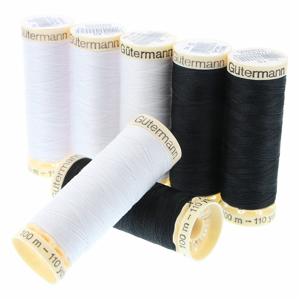 7 spools of Gutermann's 100m MCT Sew-All thread in Black and White; 3 black and 4 white spools